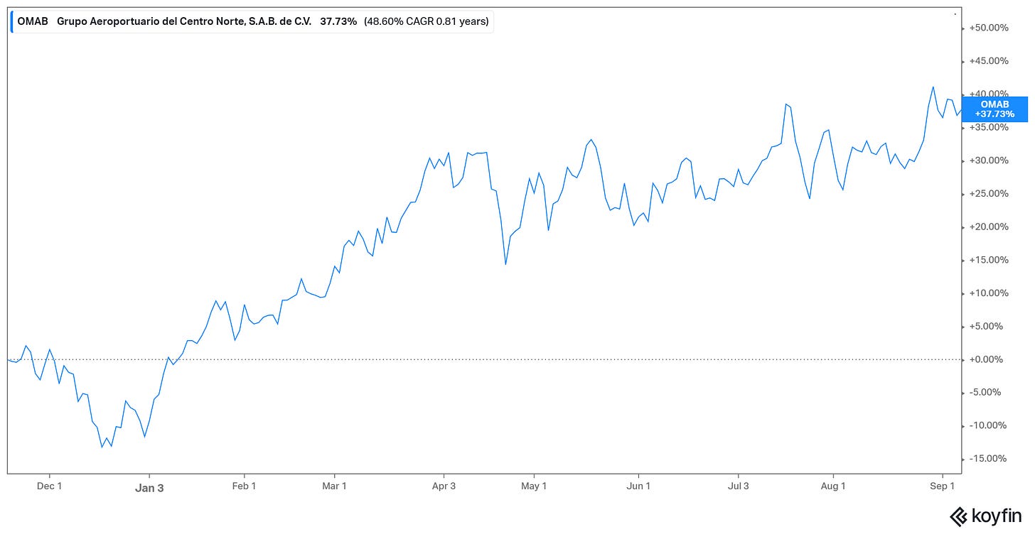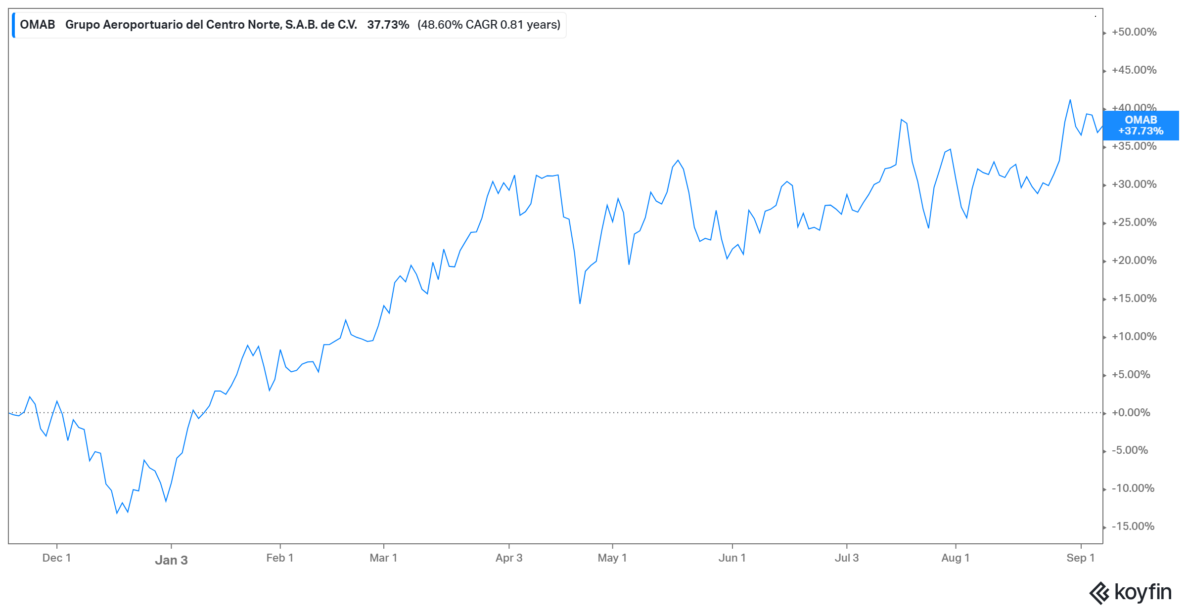 OMAB is one of the three Mexican airport operators and this stock has been flying (pun intended). The company is in the Sleepy Global portfolio and unlikely to come out any time soon.
