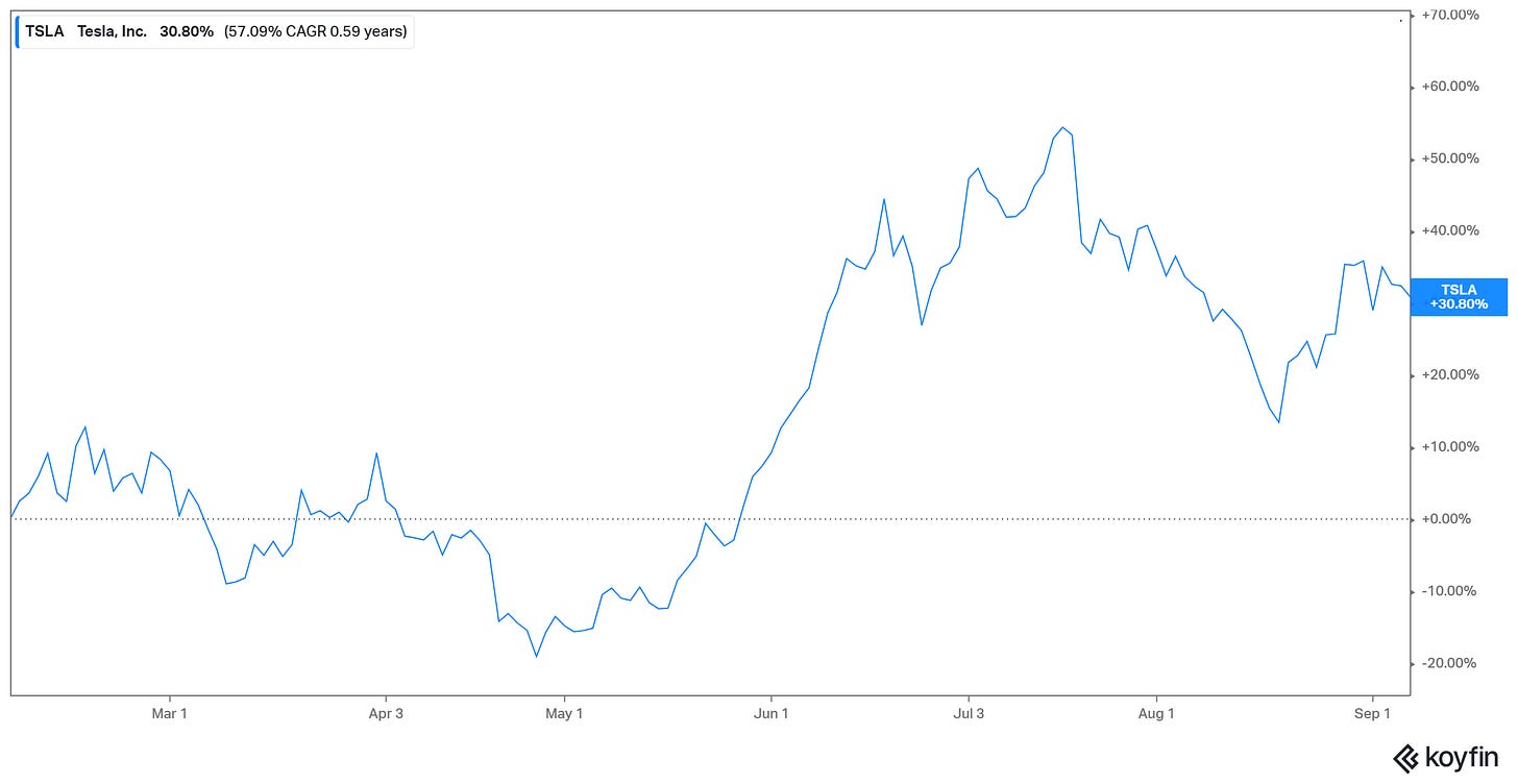 Of course, that hasn’t hurt the stonk (yet). Tesla has been lumped into the AI bubble and Mag7.