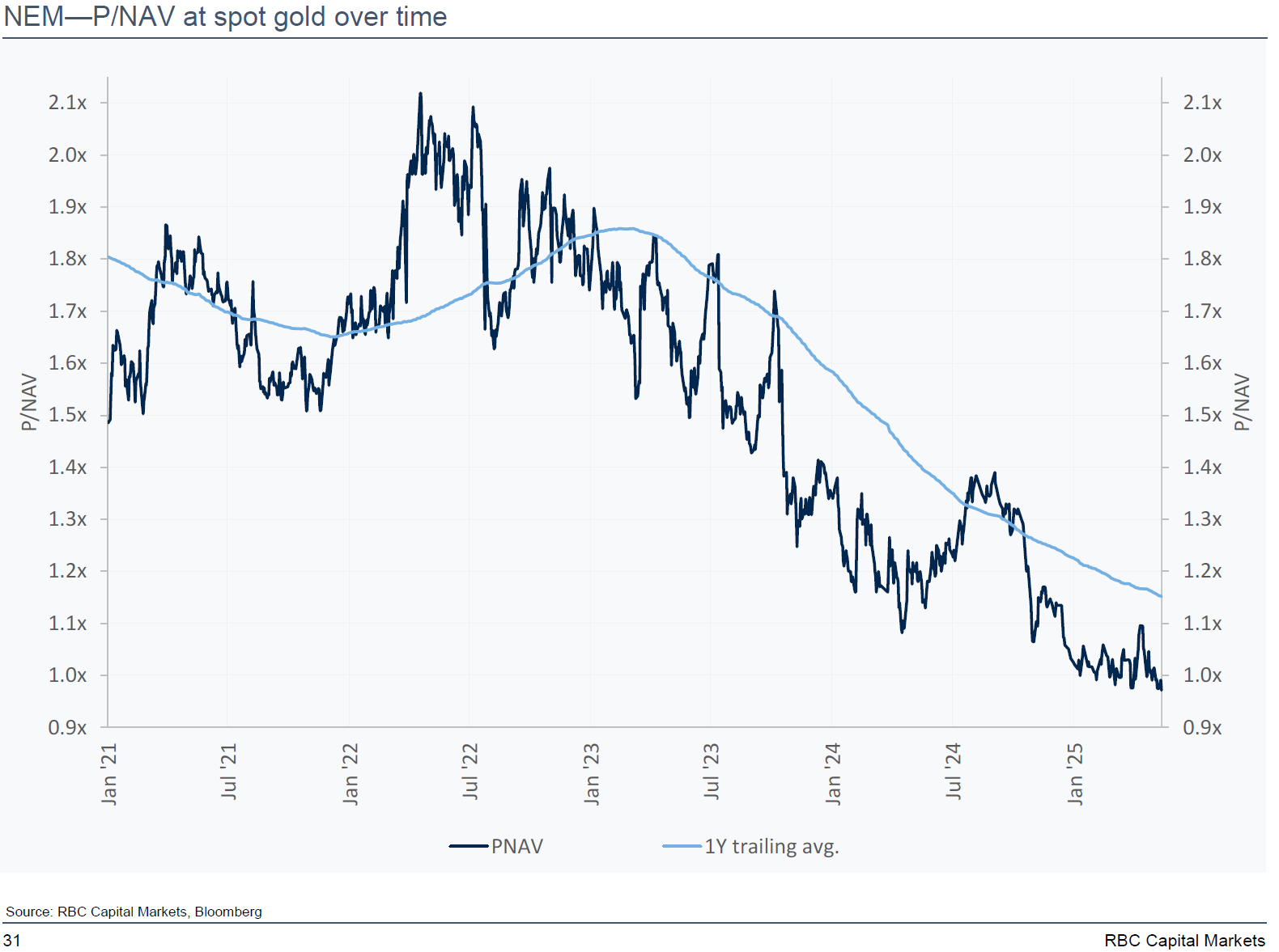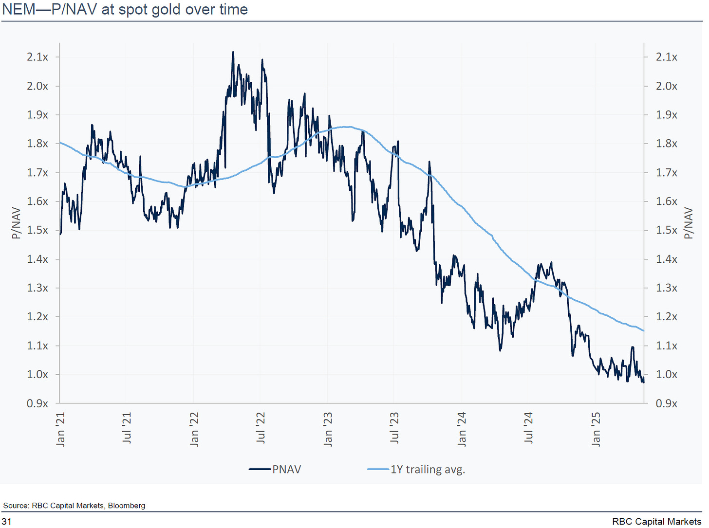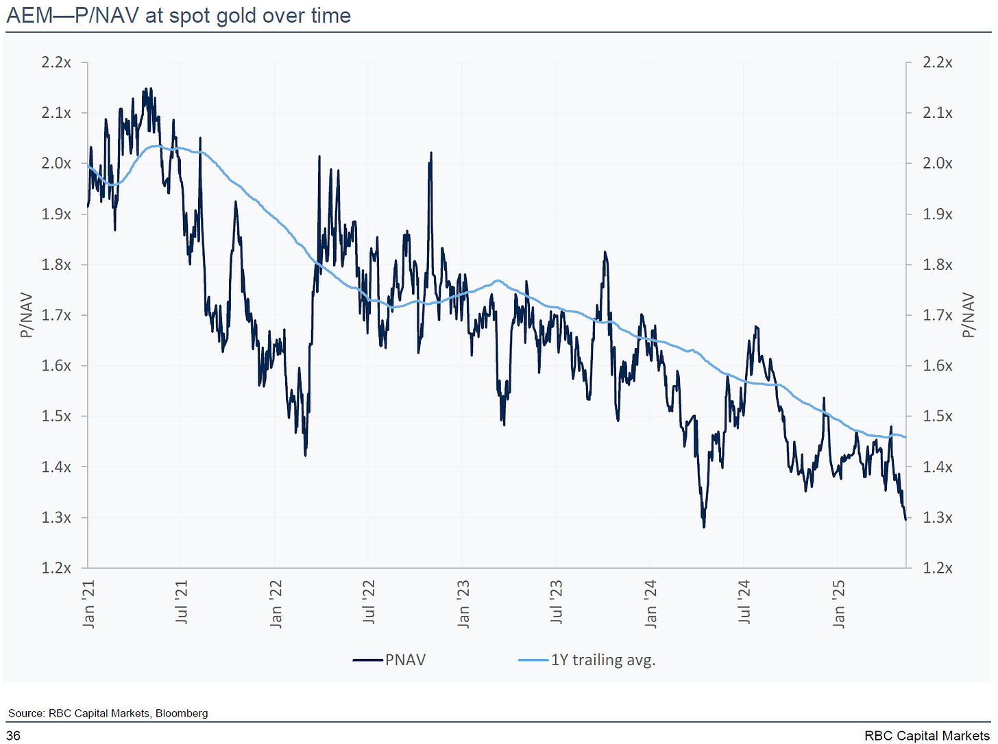 I think investors continue to underestimate just how cheap and profitable gold miners are, given current spot gold prices and oil/diesel costs. Here are a couple of price-to-NAV charts by RBC (but they all look the same).
