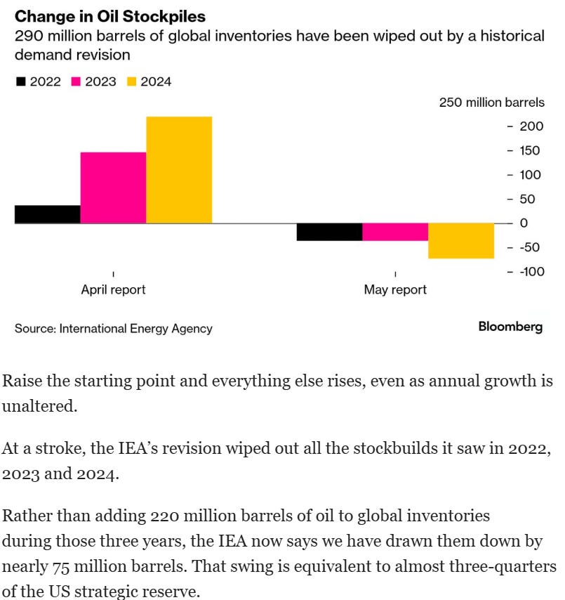 Meanwhile, the IEA with a stroke of a pen, “deleted” 290 million barrels of oil (or roughly half of the US SPR). As they “realized” they had underestimated oil demand for the last 3 years.