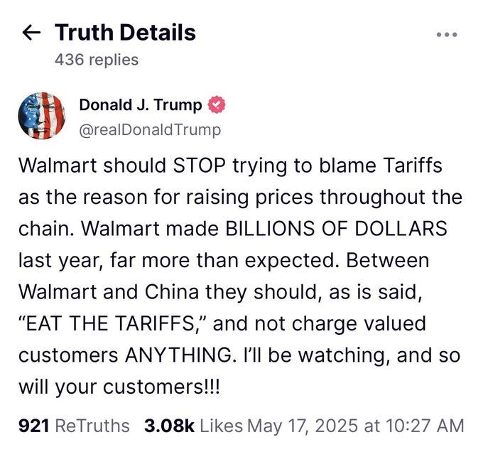From “the most business-friendly administration I’ve seen in my lifetime”, Trump wants Walmart to eat the entire cost of the tariffs (which would exceed all of their profits).