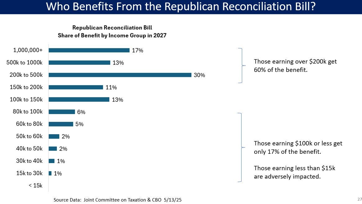 Not everyone will benefit from the House Reconciliation bill either. There are big cuts to social programs like Medicaid and Food Stamps (along with other smaller cuts) to offset some of the costs of the tax cuts. In short, the top 1% will capture the majority of the benefits (and the top 10% capture almost all of it).